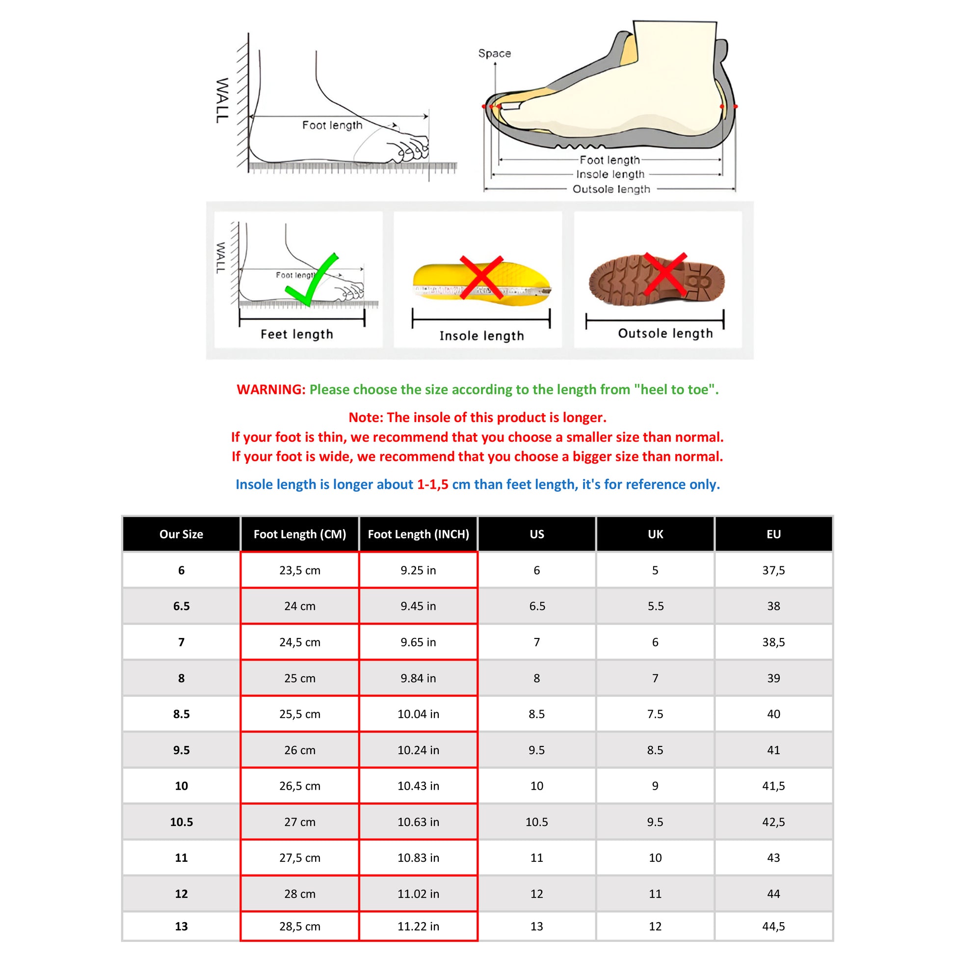 La meilleure façon de choisir la bonne pointure pour un pied standard est de mesurer la longueur de votre pied « du talon aux orteils » et de sélectionner la pointure correspondante dans le tableau des tailles.